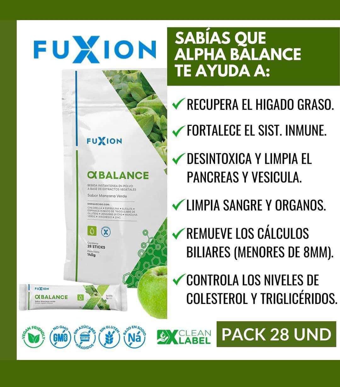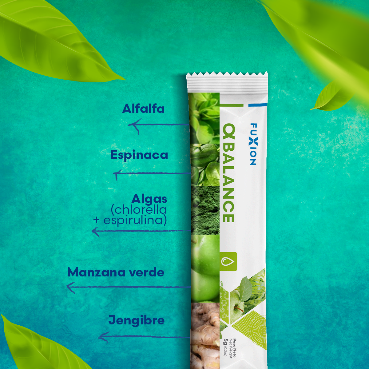 ALPHA BALANCE es una bebida saludable a base de vegetales verdes, desarrollada por FuXion para apoyar la limpieza de órganos internos y la desintoxicación sanguínea, además de mantener el equilibrio del pH corporal. Esta fórmula nutracéutica combina Alfalfa, Algas (Espirulina, Chlorella), Espinaca, Pasto de Trigo, Manzana Verde, Jengibre, vitaminas y minerales como Magnesio y Zinc en su forma orgánica. Alpha Balance favorece la eliminación de toxinas, ácidos y metales pesados, al tiempo que fortalece el sistema inmunológico para promover una vida saludable y llena de energía.
