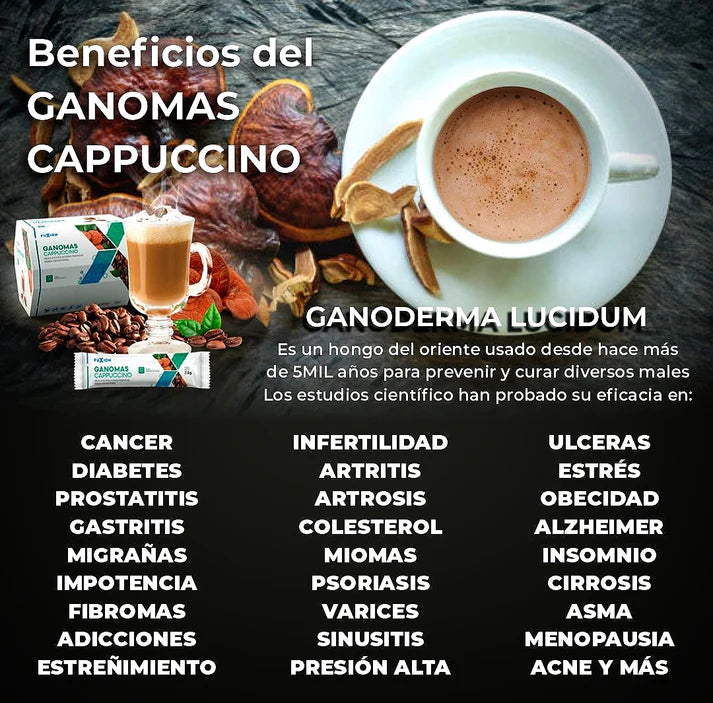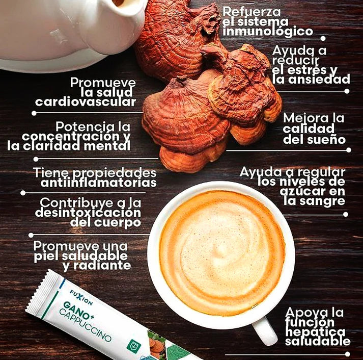 Disfruta de un exquisito Café Cappuccino enriquecido con Ganoderma Lucidum, desarrollado por FuXion para fortalecer tu sistema inmunológico y ayudar a prevenir enfermedades degenerativas. Este café combina el sabor clásico con las propiedades antiinflamatorias y antitumorales del hongo silvestre asiático. Su fórmula, rica en antioxidantes y micronutrientes, favorece la inhibición del crecimiento de células malignas, mejora la circulación, regula la hipertensión y el colesterol, y potencia las defensas antioxidantes para reducir el riesgo de infecciones.