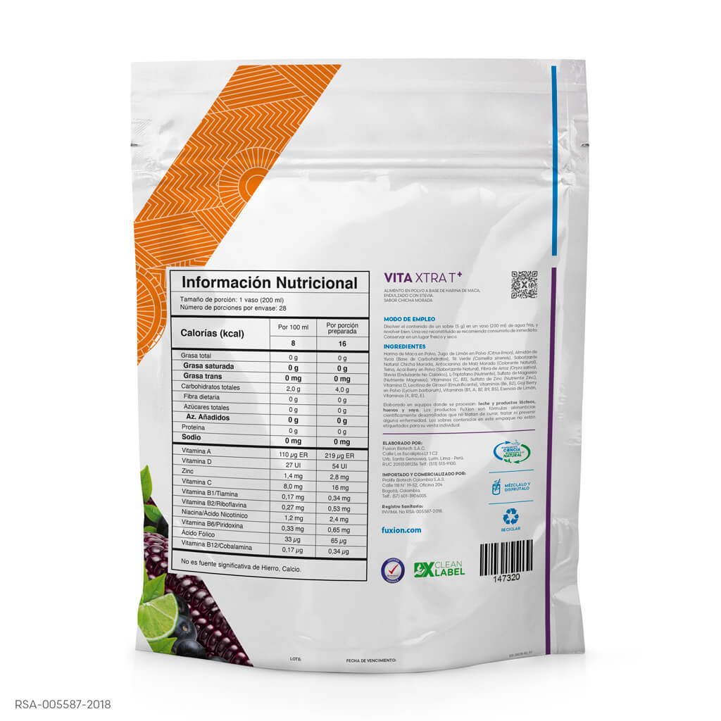 VITA XTRA T+ FuXion x 28 Sobres es una bebida funcional con sabor a maíz morado, diseñada para ofrecer beneficios antioxidantes y energizantes. Su fórmula nutracéutica combina Guayusa, Té Verde, Acai Berry, Goji Berry, Micelio de Cordyceps, Maca, Ginseng, antocianinas del maíz morado, fibra, vitaminas y minerales orgánicos. Esta mezcla eficiente potencia la energía natural gracias al Té Verde y el Guayusa, mientras que el Micelio de Cordyceps, Maca y Goji Berry fortalecen la resistencia física. Además, contribuye a mantener una actitud positiva y alerta, mejora el rendimiento físico diario y protege las células contra el daño oxidativo y los radicales libres.