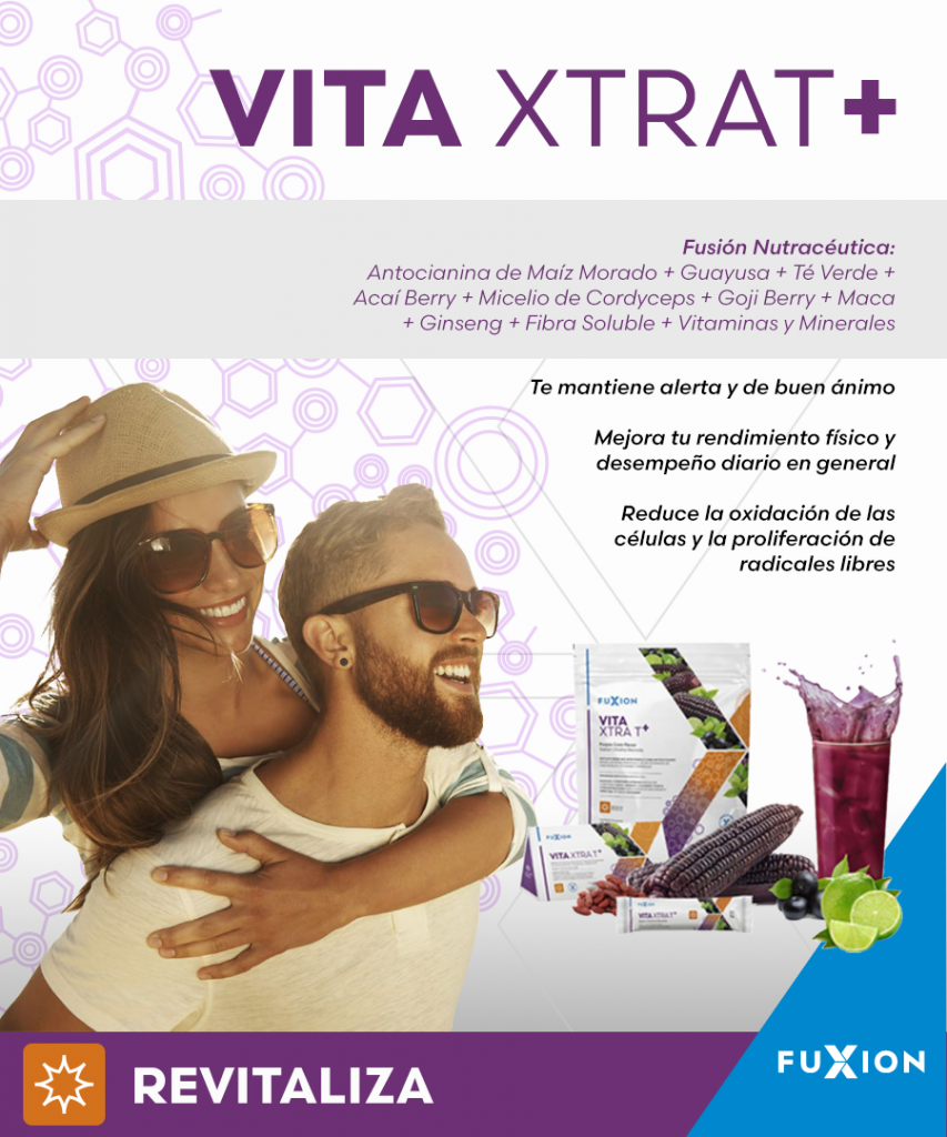 VITA XTRA T+ FuXion x 7 Sobres es una bebida funcional con sabor a maíz morado, diseñada para ofrecer beneficios antioxidantes y energizantes. Su fórmula nutracéutica combina Guayusa, Té Verde, Acai Berry, Goji Berry, Micelio de Cordyceps, Maca, Ginseng, antocianinas del maíz morado, fibra, vitaminas y minerales orgánicos. Esta mezcla eficiente potencia la energía natural gracias al Té Verde y el Guayusa, mientras que el Micelio de Cordyceps, Maca y Goji Berry fortalecen la resistencia física. Además, contribuye a mantener una actitud positiva y alerta, mejora el rendimiento físico diario y protege las células contra el daño oxidativo y los radicales libres.